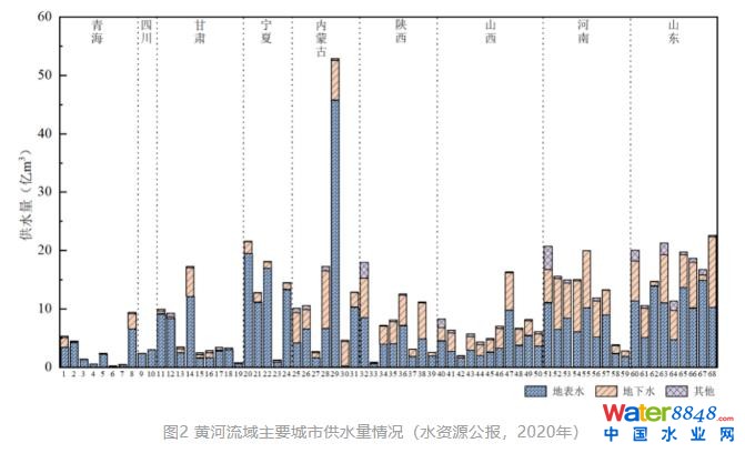 2020年黃河流域68個主要城市供水總量為675億m3,其中地表水為主要的供水水源,為434億m3,占總供水量的64.3%;地下水供水量為212億m3,占總供水量的31.4%;其他水源(包括再生水、集雨工程、海水淡化等)為29億m3,占總供水量的4.3%。