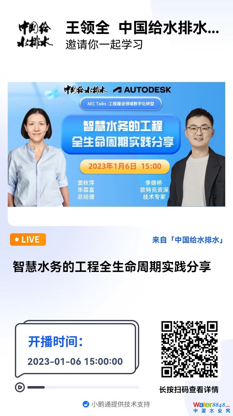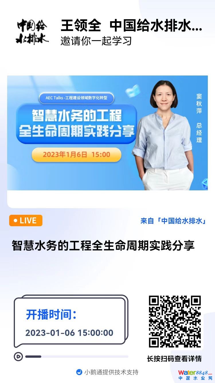 放大字體  縮小字體 發(fā)布日期:2022-12-30  來源:智慧水務(wù)的工程全生命周期實(shí)踐分享 直播時(shí)間:2023年1月6  瀏覽次數(shù):188
