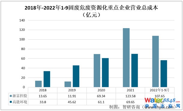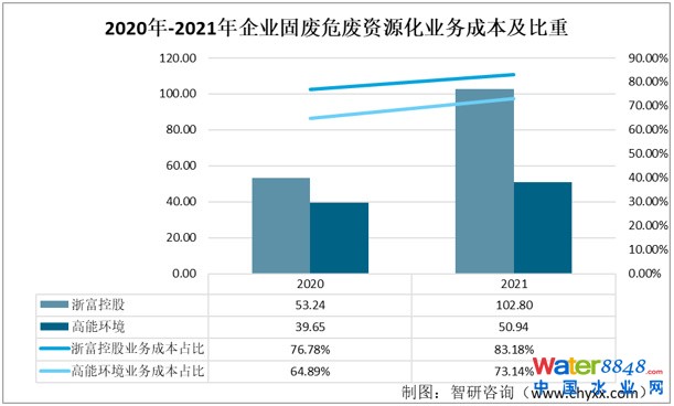 從營(yíng)業(yè)成本來看,自2020年以來兩家企業(yè)固廢危廢資源化的營(yíng)業(yè)成本也呈現(xiàn)出逐年上升的趨勢(shì),2021年,浙富控股和高能環(huán)境的固廢危廢資源化營(yíng)業(yè)成本分別為102.8和50.94億元,占總成本比重為83.18%和73.14%。