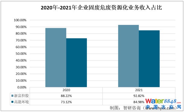 兩家企業(yè)的固廢危廢資源化業(yè)務(wù)收入占比都達(dá)到了70%以上,可見固廢危廢資源化業(yè)務(wù)是兩家企業(yè)的主營(yíng)業(yè)務(wù)。2021年,浙富控股和高能環(huán)境的固廢危廢資源化業(yè)務(wù)占比分別為92.82%和84.98%。