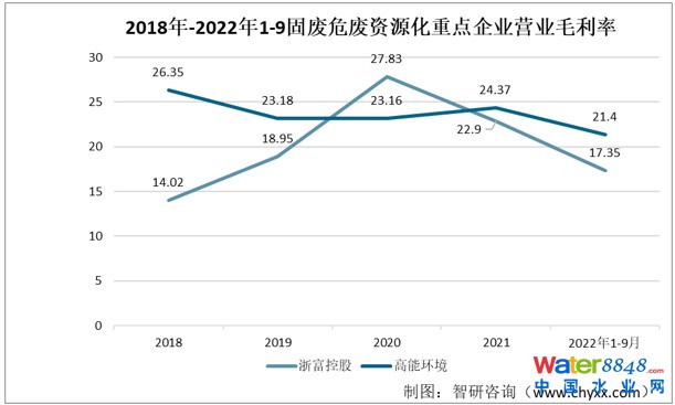 數(shù)據(jù)顯示,兩家企業(yè)的毛利率相差不大,總體而言,高能環(huán)境的毛利率要略大于浙富控股。2022年1-9月,浙富控股毛利率為17.35%,高能環(huán)境的毛利率為21.4%。