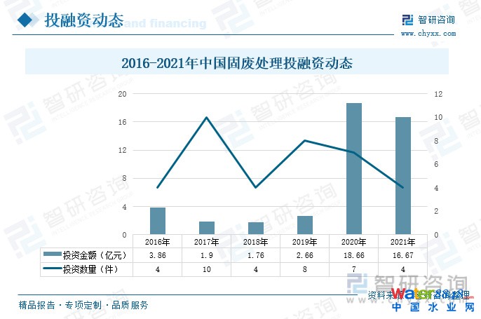 近年來,隨著國家和各級(jí)政府對于固廢危廢行業(yè)的扶持力度逐漸增大,行業(yè)發(fā)展提速,也逐漸受到資本市場的關(guān)注,2020、2021年行業(yè)獲得投資金額均突破15億元,達(dá)18.66億元、16.67億元,較往年迎來大幅增長。“十三五”“十四五”期間,固廢危廢的資源化利用得到快速發(fā)展,行業(yè)所獲得的資金持續(xù)增加,給行業(yè)帶來了新的發(fā)展機(jī)遇,行業(yè)發(fā)展步入新階段。