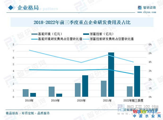 2018年以來,高能環(huán)境和浙富控股對于科研投入都較為重視,持續(xù)增加對于技術(shù)和項(xiàng)目的研發(fā)投入,高能環(huán)境在此期間的費(fèi)用投入較為穩(wěn)定,保持增長的態(tài)勢,浙富控股2020年在固廢危廢資源化利用領(lǐng)域布局過后,研發(fā)費(fèi)用激增,2020年過后,研發(fā)費(fèi)用大幅度增長。2022年前三季度高能環(huán)境的研發(fā)費(fèi)用為1.62億元,較2021年同期增長了24.47%,占總營業(yè)收入的2.62%;浙富控股的研發(fā)費(fèi)用為4.73%,同比微漲了0.3%,占總營業(yè)收入的4%。兩家企業(yè)對于固廢危廢處置行業(yè)的技術(shù)研發(fā)都較為重視,研發(fā)費(fèi)用逐年遞增,但總體上占總營收的比重小,存在較大的增長空間。
