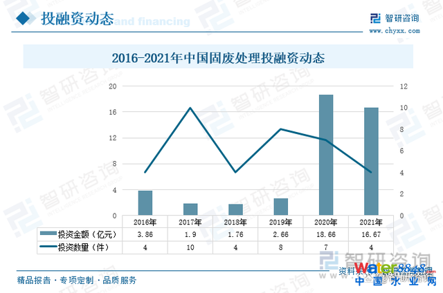 近年來,隨著國家和各級政府對于固廢危廢行業(yè)的扶持力度逐漸增大,行業(yè)發(fā)展提速,也逐漸受到資本市場的關(guān)注,2020、2021年行業(yè)獲得投資金額均突破15億元,達(dá)18.66億元、16.67億元,較往年迎來大幅增長。“十三五”“十四五”期間,固廢危廢的資源化利用得到快速發(fā)展,行業(yè)所獲得的資金持續(xù)增加,給行業(yè)帶來了新的發(fā)展機遇,行業(yè)發(fā)展步入新階段。