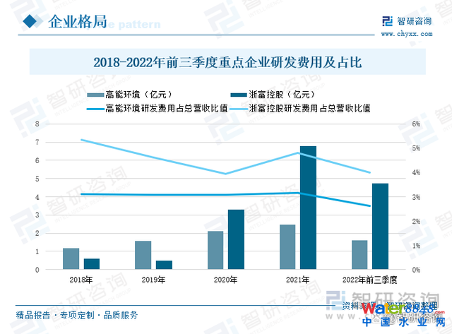 2018年以來,高能環(huán)境和浙富控股對于科研投入都較為重視,持續(xù)增加對于技術(shù)和項目的研發(fā)投入,高能環(huán)境在此期間的費用投入較為穩(wěn)定,保持增長的態(tài)勢,浙富控股2020年在固廢危廢資源化利用領(lǐng)域布局過后,研發(fā)費用激增,2020年過后,研發(fā)費用大幅度增長。2022年前三季度高能環(huán)境的研發(fā)費用為1.62億元,較2021年同期增長了24.47%,占總營業(yè)收入的2.62%;浙富控股的研發(fā)費用為4.73%,同比微漲了0.3%,占總營業(yè)收入的4%。兩家企業(yè)對于固廢危廢處置行業(yè)的技術(shù)研發(fā)都較為重視,研發(fā)費用逐年遞增,但總體上占總營收的比重小,存在較大的增長空間。