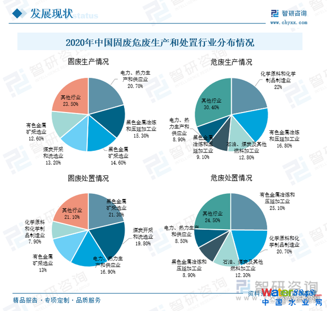 據(jù)生態(tài)環(huán)境部發(fā)布的《2020年中國生態(tài)環(huán)境統(tǒng)計年報》顯示,2020年我國工業(yè)固體廢棄物生產(chǎn)量靠前的行業(yè)有電力、熱力生產(chǎn)和供應(yīng)業(yè),黑色金屬冶煉和壓延加工業(yè),黑色金屬礦采選業(yè);在固廢的處置和綜合利用中,領(lǐng)先的行業(yè)有黑色金屬礦采選業(yè)、煤炭開采和洗選業(yè)、電力熱力生產(chǎn)和供應(yīng)業(yè),占比分別為21.3%、19.8%、16.9%。2022年我國危廢生產(chǎn)量主要集中在化學(xué)原料和化學(xué)制品制造業(yè),有色金屬冶煉和壓延加工業(yè),石油、煤炭及其他燃料加工業(yè)等行業(yè)領(lǐng)域;危廢處置排名靠前的主要有有色金屬冶煉和壓延加工業(yè),化學(xué)原料和化學(xué)制品制造業(yè),石油、煤炭及其他燃料加工業(yè),占比分別為25.1%、20.7%、12.3%。