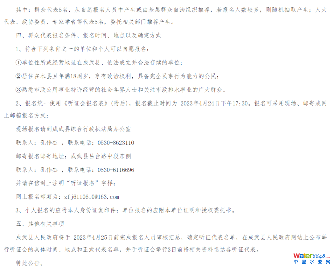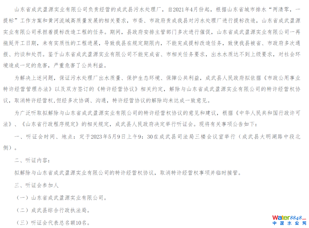 為“擬解除與山東省成武盈源實業(yè)有限公司的特許經營權協(xié)議,取消特許經營權事項并臨時接管”一事,成武縣人民政府決定舉行聽證會。