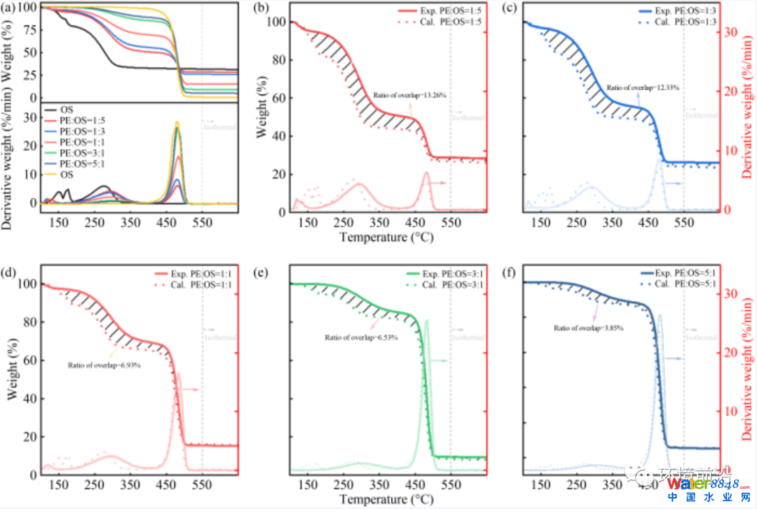 圖2 (a)油泥、聚乙烯塑料及其混合物的熱重曲線;(b)–(f)混合物熱重曲線的實驗值和計算值的對比 (圖中OS為油泥,PE為聚乙烯塑料)