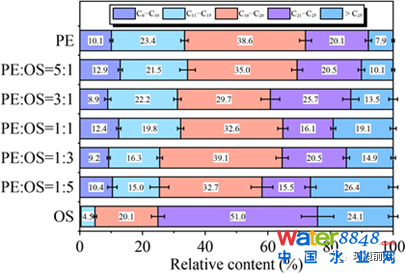 圖3 油泥、聚乙烯塑料及其混合物熱解產(chǎn)油成分 (圖中OS為油泥,PE為聚乙烯塑料)