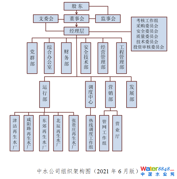 核心提示:天津中水有限公司 發(fā)布于 2022-11-16 17:04:00 一、企業(yè)概況 1.公司簡介 天津中水有限公司為創(chuàng)業(yè)環(huán)保集團(tuán)的全資子公司,自2001年1月10日成立,注冊資本壹億元人民幣,主要負(fù)責(zé)天津市主城區(qū)再生水的制水、輸配、銷售以及再生水廠建設(shè)運(yùn)營和再生水設(shè)施管理,是天津市首家專業(yè)從事再生水處理和利用的公司。再生水主要回用于生活雜用、園林綠化、景觀環(huán)境、工業(yè)循環(huán)冷卻等多個(gè)應(yīng)用領(lǐng)域。目前,中水公司已建設(shè)、運(yùn)營5座再生水廠,處理總規(guī)模25萬噸/天,分別為津沽再生水廠、咸陽路再生水廠、東郊再生水