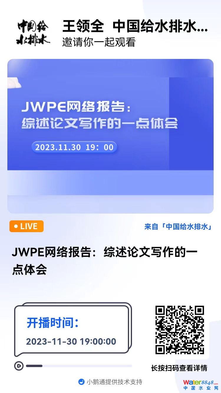 中國水協(xié)團(tuán)體標(biāo)準(zhǔn)《城鎮(zhèn)污水資源與能源回收利用技術(shù)規(guī)程》宣貫會通知 中國城鎮(zhèn)供水排水協(xié)會 2023年11月14日9:00線上舉行直播/JWPE網(wǎng)絡(luò)報告:提高飲用水安全性:應(yīng)對新的影響并識別重要的毒性因素