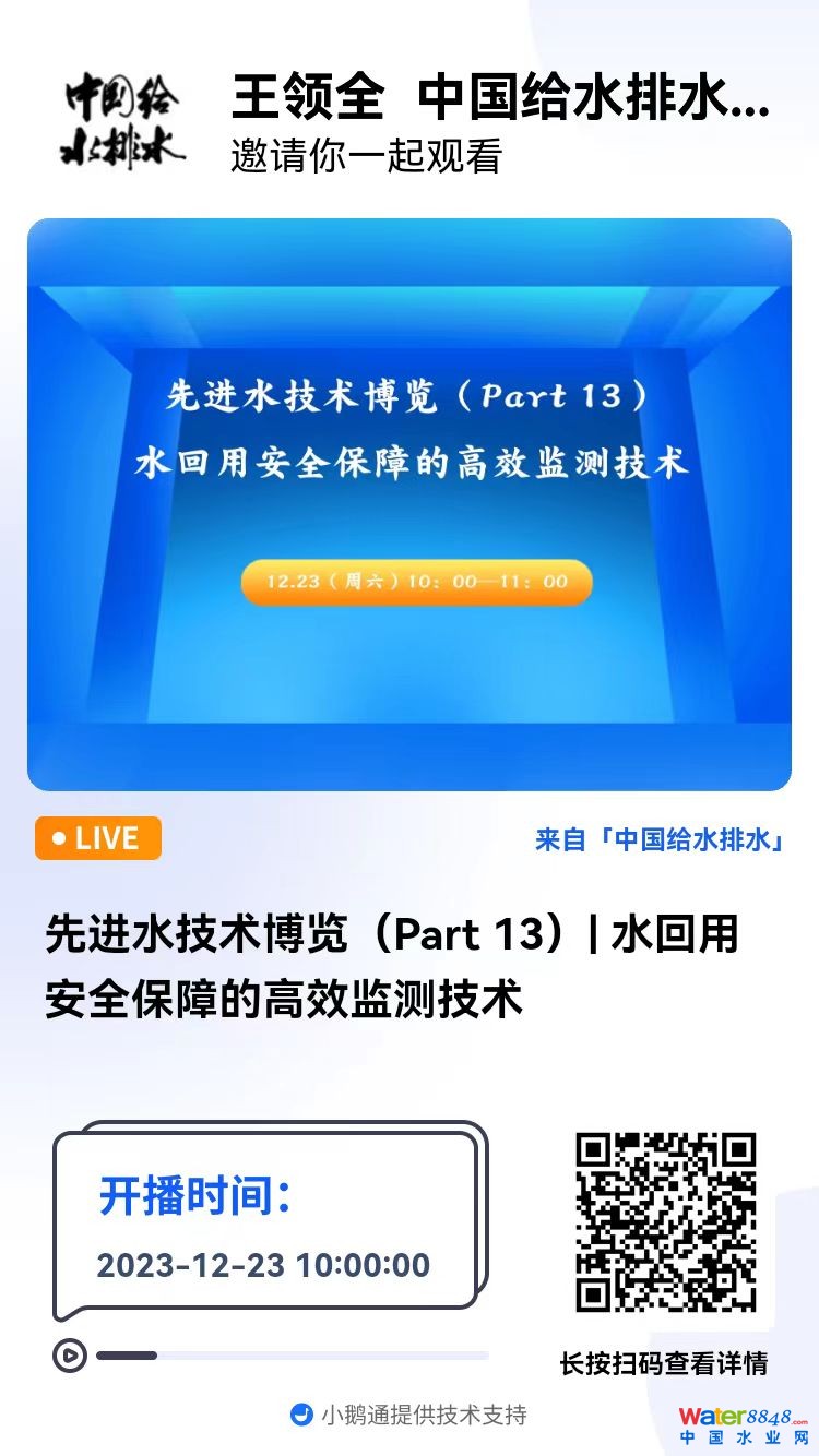 技術(shù)沙龍 | 先進(jìn)水技術(shù)博覽(Part 11) 直播時(shí)間:8月19日(周六)上午10:00-12:00 2023-08-19 10:00:00  廣東匯祥環(huán)境科技有限公司  湛蛟  技術(shù)總監(jiān)  天津萬(wàn) 中國(guó)水業(yè)院士論壇-中國(guó)給水排水直播平臺(tái)(微信公眾號(hào)cnww1985):自然—社會(huì)水循環(huán)與水安全學(xué)術(shù)研討會(huì)