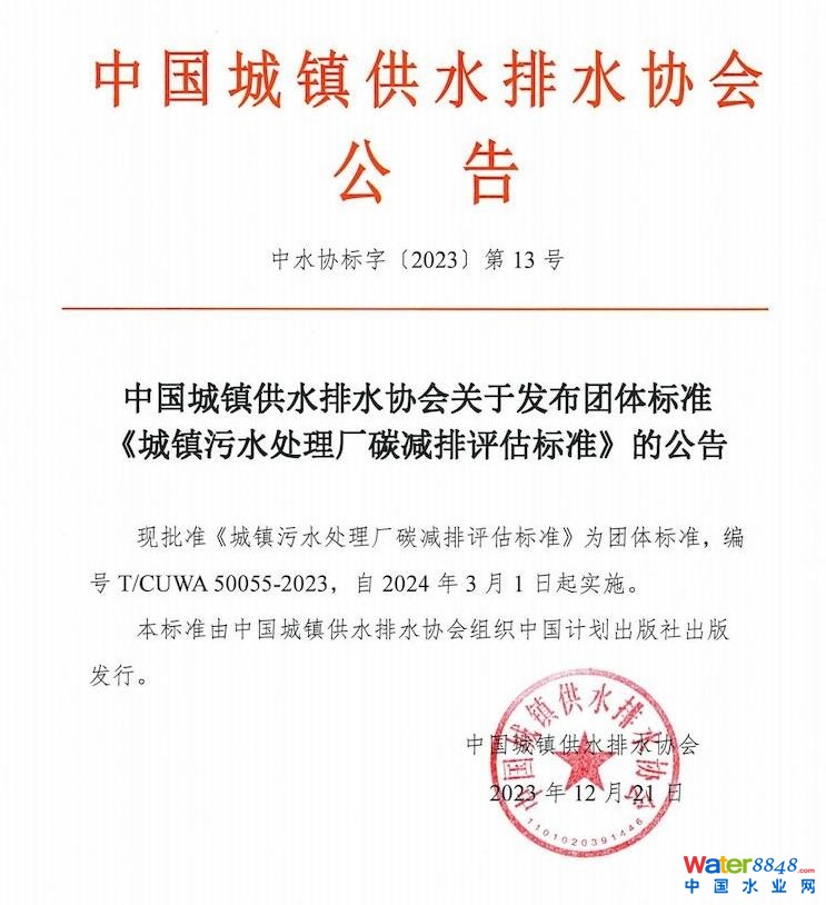 中國(guó)城鎮(zhèn)供水排水協(xié)會(huì)發(fā)布 《城鎮(zhèn)污水處理廠碳減排評(píng)估標(biāo)準(zhǔn)》團(tuán)體標(biāo)準(zhǔn),自2024年3月1日起實(shí)施