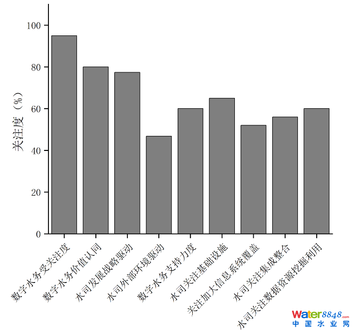 在2017—2020年,在中國城鎮(zhèn)供水排水協(xié)會的帶領(lǐng)下,珠海卓邦科技有限公司對全國1000多家代表性水務(wù)企業(yè)開展了智慧水務(wù)建設(shè)調(diào)研。其中,95%以上的水務(wù)企業(yè)正在密切關(guān)注智慧水務(wù)的行業(yè)動態(tài),越來越多的數(shù)字化領(lǐng)先水務(wù)企業(yè)都在啟動頂層設(shè)計(jì)工作;80%以上的水務(wù)企業(yè)認(rèn)同智慧水務(wù)在提升效率、管理增效、提升企業(yè)形象、保障安全等方面的價(jià)值;77.4%的水務(wù)企業(yè)發(fā)展智慧水務(wù)的動力來源于公司內(nèi)部的發(fā)展戰(zhàn)略需求,46.8%的水務(wù)企業(yè)則來自于外部環(huán)境的推動;60%以上的企業(yè)表示高管對于智慧水務(wù)支持力度極大,包括組織、資金、政策、人員支持等方面;在智慧水務(wù)發(fā)展的過程中,65%的水務(wù)企業(yè)關(guān)注基礎(chǔ)設(shè)施的建設(shè),52%的水務(wù)企業(yè)關(guān)注信息系統(tǒng)覆蓋范圍的拓展,56%的水務(wù)企業(yè)關(guān)注集成整合,60%以上的水務(wù)企業(yè)關(guān)注數(shù)據(jù)資源的挖掘利用 。