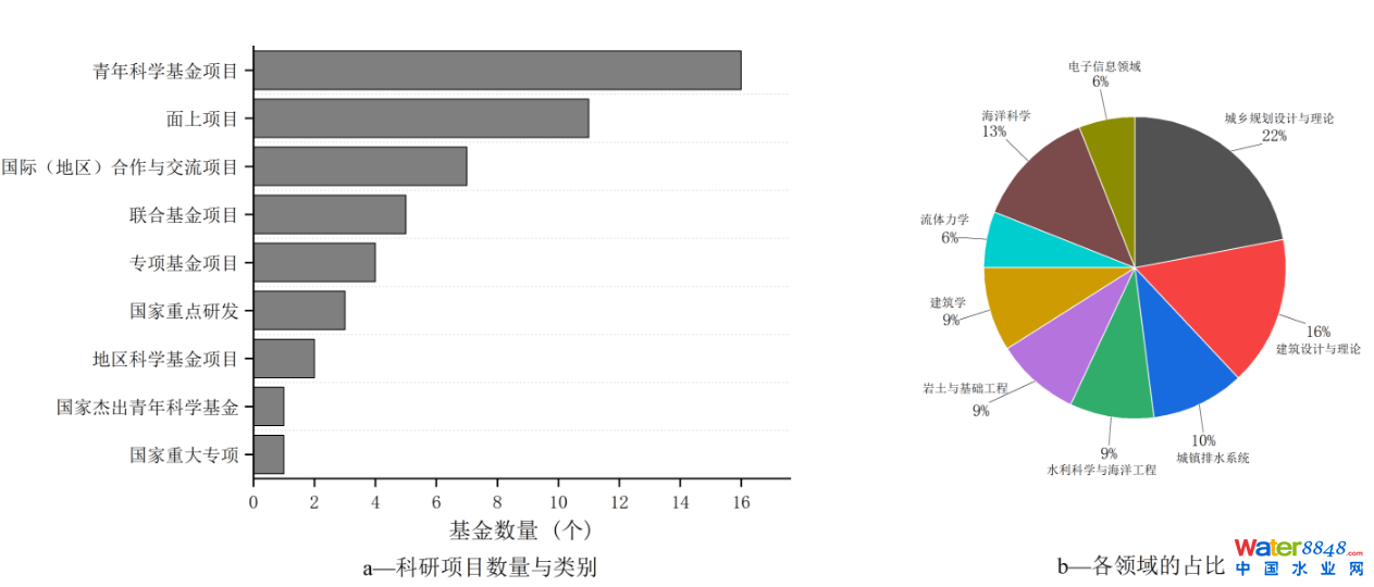 相較于歐美的數(shù)字水務(wù)注重理論和基礎(chǔ)方法創(chuàng)新,我國智慧水務(wù)科研注重技術(shù)應(yīng)用和解決實(shí)際水務(wù)問題,例如水質(zhì)監(jiān)測和污染控制,主要以政府機(jī)構(gòu)、科研院所、大學(xué)和企業(yè)等多方合作的方式?蒲谐晒矫,如圖6所示,圍繞“智慧+水務(wù)”作為關(guān)鍵詞的國家級課題共計(jì)95個(gè),其中與城市相關(guān)的主題資助率較高。但資助領(lǐng)域交叉性強(qiáng),與水務(wù)直接相關(guān)性小,水務(wù)科研人員參與度有待提高。華北院自主研發(fā)的一體機(jī)大腦Simuwater,是國內(nèi)首款集機(jī)理模型、概化模型及人工智能于一體的混合模型,實(shí)現(xiàn)了無縫耦合流域城市排水系統(tǒng)仿真,打破了排水系統(tǒng)仿真受限于國外的瓶頸。而哈爾濱工業(yè)大學(xué)主導(dǎo)開發(fā)的基于AI的碳排核算模型(馬頭崗污水廠項(xiàng)目),結(jié)合機(jī)理模型與數(shù)據(jù)驅(qū)動算法,建立了生物處理過程“碳代謝”模型,發(fā)展了水處理碳排放實(shí)時(shí)計(jì)量方法,實(shí)現(xiàn)了碳排放的分鐘級別計(jì)量。博愛第二污水廠項(xiàng)目應(yīng)用數(shù)字孿生賦能污水廠低碳運(yùn)維,采用三維可視化建模,工藝仿真、自控仿真和三維可視化等技術(shù)構(gòu)建了三維虛擬水廠,整合了設(shè)備的靜態(tài)數(shù)據(jù)和運(yùn)行動態(tài)數(shù)據(jù),實(shí)時(shí)反映現(xiàn)場細(xì)節(jié),實(shí)現(xiàn)水質(zhì)預(yù)測、水量預(yù)測、生化分析、物料平衡、運(yùn)行調(diào)整、設(shè)備維護(hù)、故障診斷等功能。