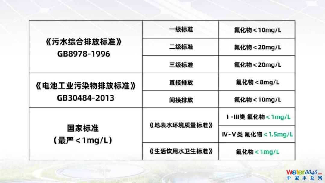 近年來,從國家到各地方也相繼出臺了一系列工業(yè)廢水重點污染物排放總量控制指標(biāo)政策,水體氟化物治理標(biāo)準(zhǔn)和要求不斷提升,有些區(qū)域甚至以《地表水環(huán)境質(zhì)量標(biāo)準(zhǔn)》三類限值作為排放標(biāo)準(zhǔn)來執(zhí)行;《江蘇城鎮(zhèn)污水處理污染物排放標(biāo)準(zhǔn)》更是要求自2023328日起,氟化物排放限值降至1.5 mg/L環(huán)保形勢日益嚴(yán)峻。