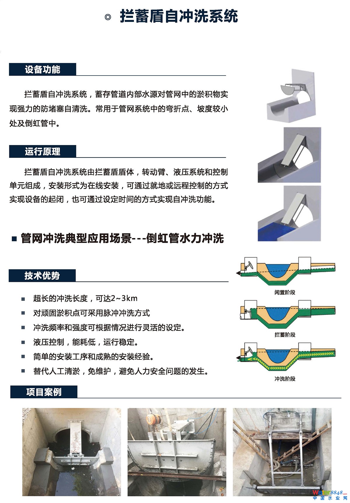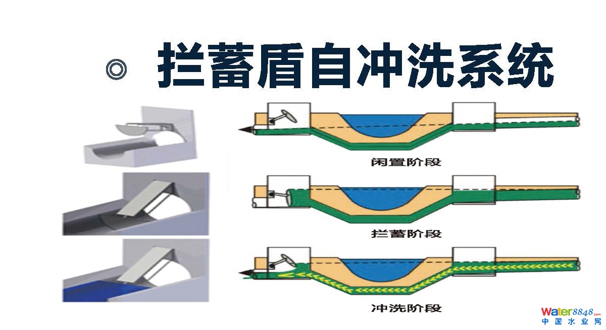 攔蓄盾自沖洗系統(tǒng),蓄存管道內(nèi)部水源對管網(wǎng)中的淤積物實(shí)現(xiàn)強(qiáng)力的防堵塞自清洗。常用于管網(wǎng)系統(tǒng)中的彎折點(diǎn)、坡度較小處及倒虹管中。攔蓄盾自沖洗系統(tǒng)由攔蓄盾盾體,轉(zhuǎn)動(dòng)臂、液壓系統(tǒng)和控制單元組成,安裝形式為在線安裝,可通過就地或遠(yuǎn)程控制的方式實(shí)現(xiàn)設(shè)備的起閉,也可通過設(shè)定時(shí)間的方式實(shí)現(xiàn)自沖洗功能。