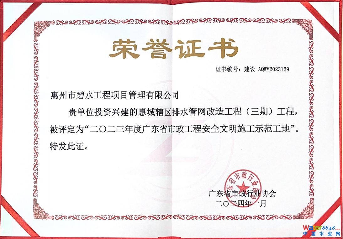 近日,水公司所屬企業(yè)碧水公司作為項(xiàng)目法人單位組織建設(shè)惠城轄區(qū)排水管網(wǎng)改造工程(三期)評為2023年度廣東省市政工程安全文明施工示范工地”。
