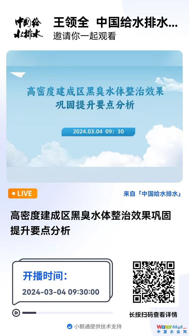 華北設(shè)計(jì)院:高密度建成區(qū)黑臭水體整治效果鞏固提升要點(diǎn)分析 直播時(shí)間:2024年3月4日(周一)9:30 2024-03-04 09:30:00 開始