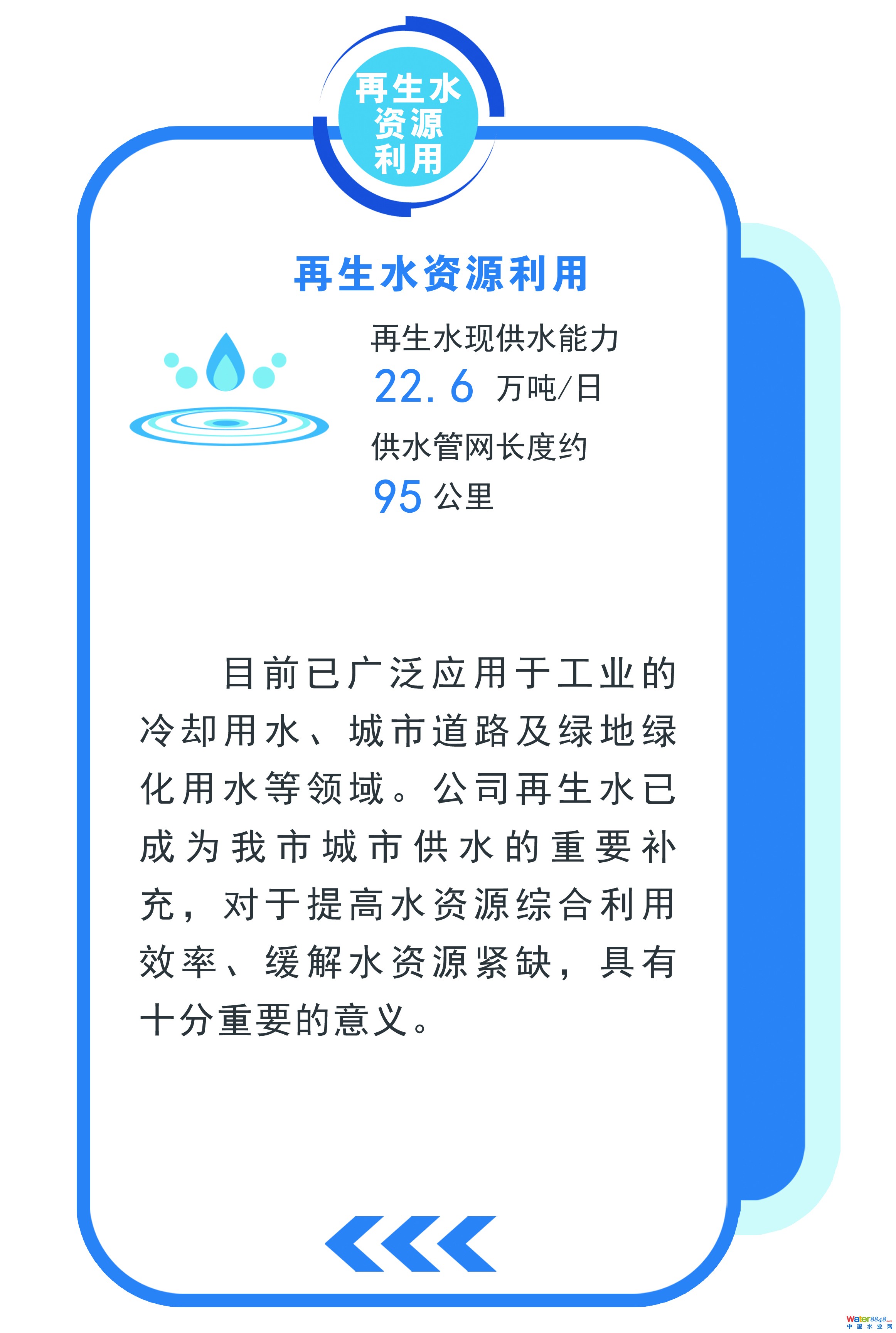 再生水現(xiàn)供水能力22.6萬噸/日,供水管網(wǎng)長度約95公里,目前已廣泛應(yīng)用于工業(yè)的冷卻用水、城市道路及綠地綠化用水等領(lǐng)域。公司再生水已成為我市城市供水的重要補(bǔ)充,對(duì)于提高水資源綜合利用效率、緩解水資源緊缺,具有十分重要的意義。