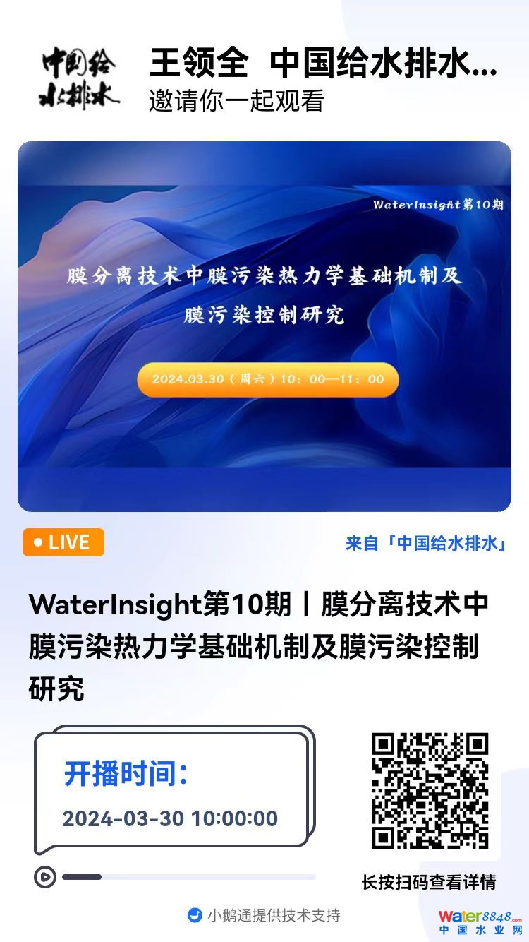核心提示:主 講 人:林紅軍 教授/博士生導(dǎo)師 主講報(bào)告:膜分離技術(shù)中膜污染熱力學(xué)基礎(chǔ)機(jī)制及膜污染控制研究 時間:2024年3月30日(周六),10:00-11:00 WaterInsight第10期丨膜分離技術(shù)中膜污染熱力學(xué)基礎(chǔ)機(jī)制及膜污染控制研究 直播時間:2024年3月30日(周六)上午10:00-11:00 2024-03-30 10:00:00 開始