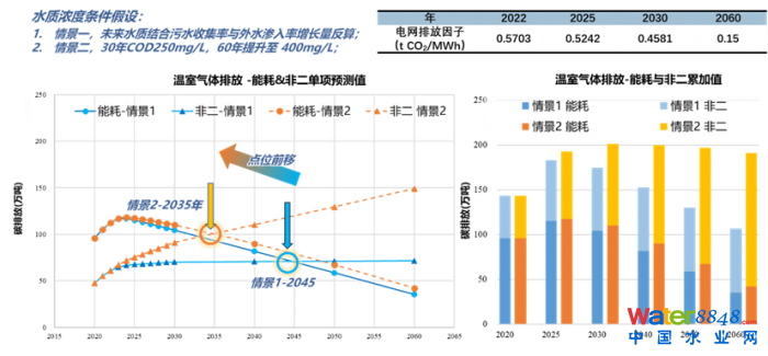 唐曉雪、王文愷等北控研究團(tuán)隊(duì),量化評估了進(jìn)水濃度提升對水務(wù)企業(yè)碳排放的影響,結(jié)果顯示在常規(guī)情景下隨著電力因子的不斷降低,非二氣體對水廠碳排放影響逐步提升至2045年超過電力能耗帶來的碳排放,而當(dāng)發(fā)生高濃度情景時(shí)(即由于化糞池的取消及管網(wǎng)控制導(dǎo)致進(jìn)水COD到2030年上升至250 mg/L;2060年上升至400mg/L),非二氣體影響將被進(jìn)一步強(qiáng)化,到2035年超過電力能耗帶來的碳排放,成為水務(wù)企業(yè)最重要的碳排放源。