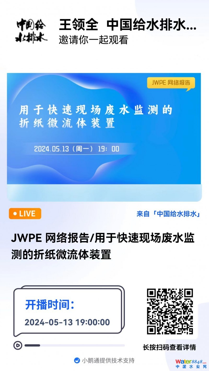 JWPE 網(wǎng)絡(luò)報告/用于快速現(xiàn)場廢水監(jiān)測的折紙微流體裝置 直播時間:2024年5月13日(星期一)19:00 2024-05-13 19:00:00 -楊竹根  英國克蘭菲爾德大學教授、高級傳感器實驗 紫外光原位固化法管道修復全產(chǎn)業(yè)鏈質(zhì)量控制倡議 直播時間:2024年5月7日(星期二)9:00-16:30 2024-05-07 09:00:00 開始