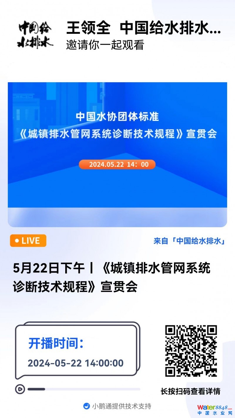 5月22日下午丨《城鎮(zhèn)排水管網(wǎng)系統(tǒng)診斷技術(shù)規(guī)程》宣貫會 直播時間:2024年5月22日(周三)14:00-16:00 2024-05-22 14:00:00 開始