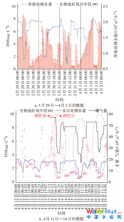 鼓風機調(diào)控前,由于風量調(diào)節(jié)難以適應(yīng)水量變化,導致低水量期氣量與能源浪費,而高水量期則氣量供應(yīng)不足。生物池處理水量、曝氣量與DO變化情況見圖3。