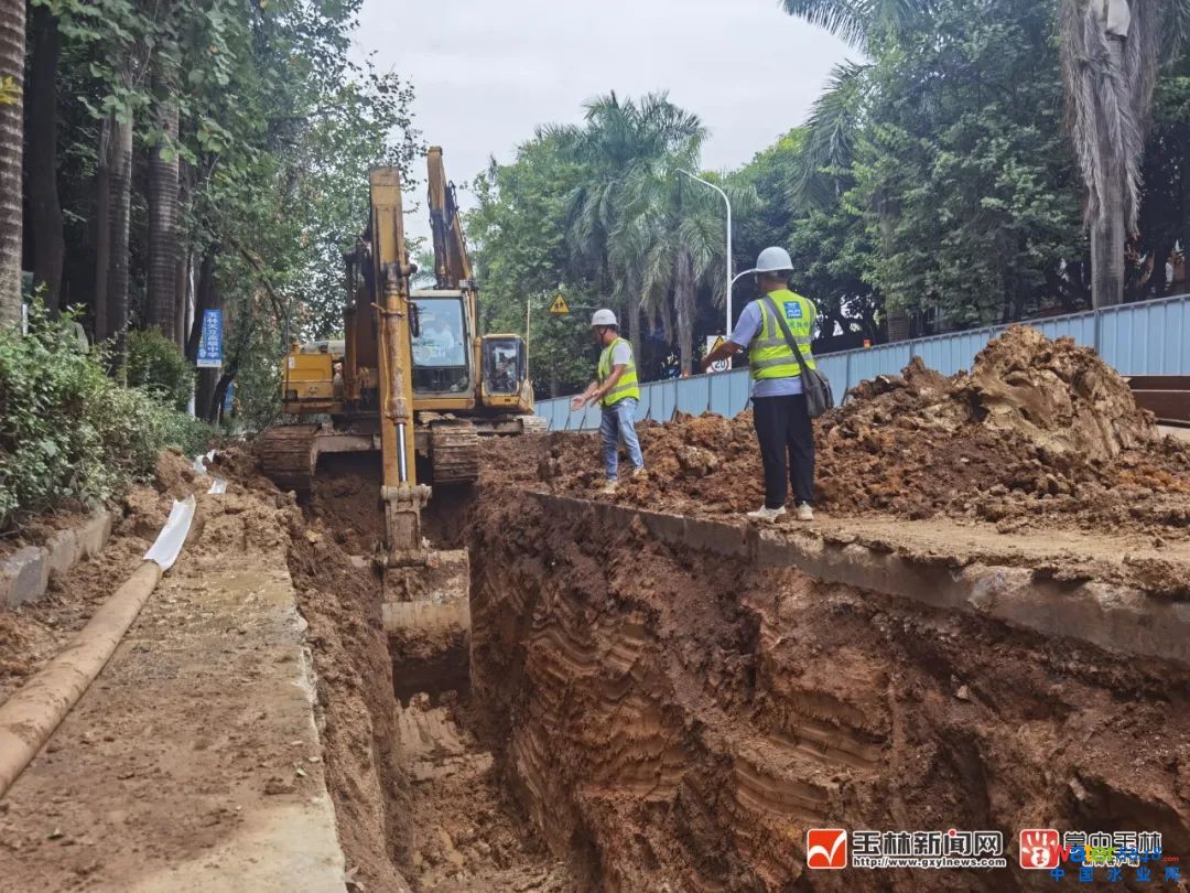 在玉林城區(qū)大北路,施工人員正在進(jìn)行溝槽開挖作業(yè)。