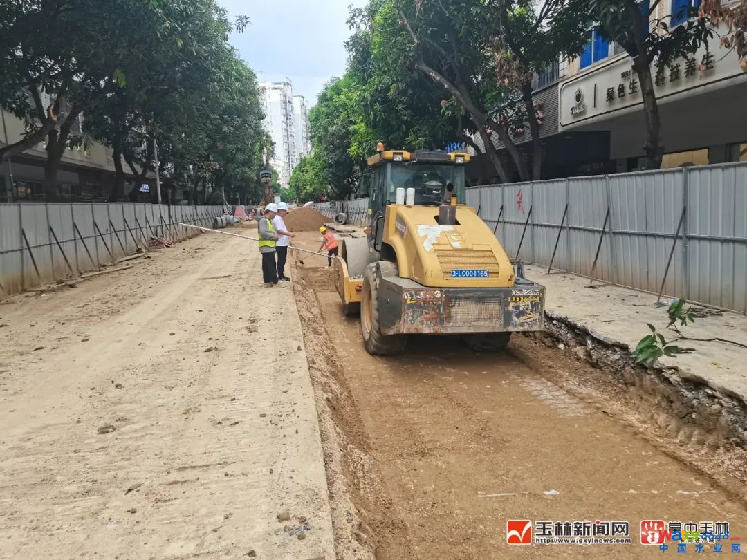 在玉林城區(qū)江口里路段,施工人員正在進(jìn)行回填土施工、道路路面恢復(fù)。