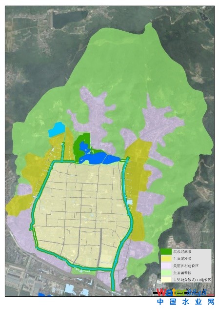 B- 美麗鄉(xiāng)村建設(shè)區(qū):現(xiàn)有村莊,增加LID設(shè)施,建設(shè)凈化濕地,控制村莊地表徑流,減少面源污染。