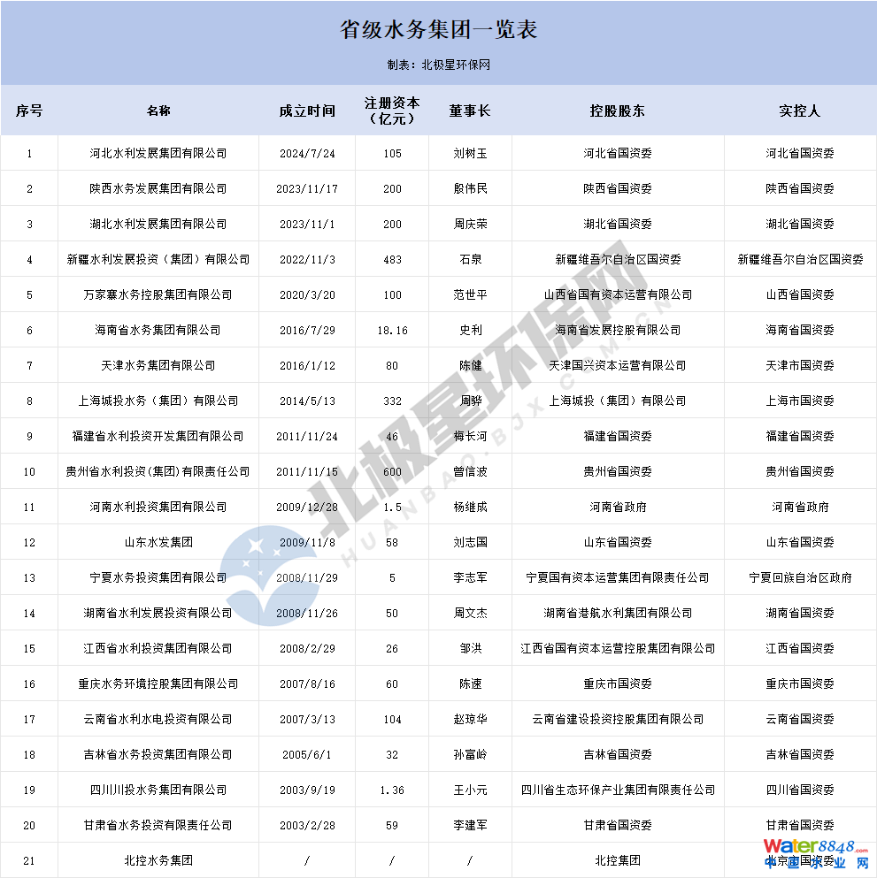 近年來,地方水務(wù)集團(tuán)近來扎堆成立,山西、寧夏、貴州、湖南、河南等多個省份新組建或重組建立水務(wù)集團(tuán)。據(jù)北極星不完全統(tǒng)計,截止到2024年7月底,已有21個省市成立省級水投集團(tuán)。企業(yè)名稱略有不同,有的地方稱為水務(wù)集團(tuán),有的地方稱為水投集團(tuán)。