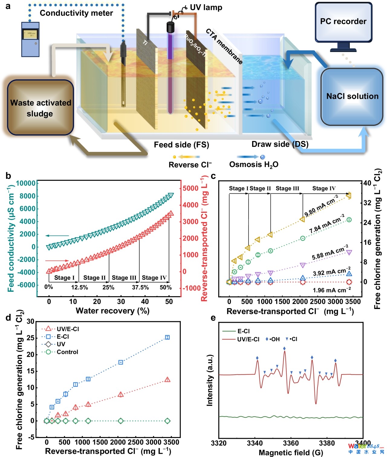 3月19日,大連理工大學(xué)環(huán)境學(xué)院張捍民教授在《自然》子刊《自然-通訊》(Nature Communications)上在線發(fā)表了題為“動態(tài)反向擴(kuò)散氯離子驅(qū)動一體化污泥調(diào)理和脫水”(Dynamic reverse Cl- driven integration of sludge conditioning and dewatering)的研究論文,提出了一種新型原位紫外/電氧化(UV/E-Cl)輔助正向滲透(FO)工藝,用于在活性污泥脫水過程中針對性控制凝膠狀膜污染。