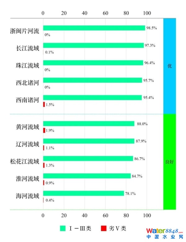 圖2 第一季度七大流域和西南、西北諸河及浙閩片河流水質(zhì)類別比例