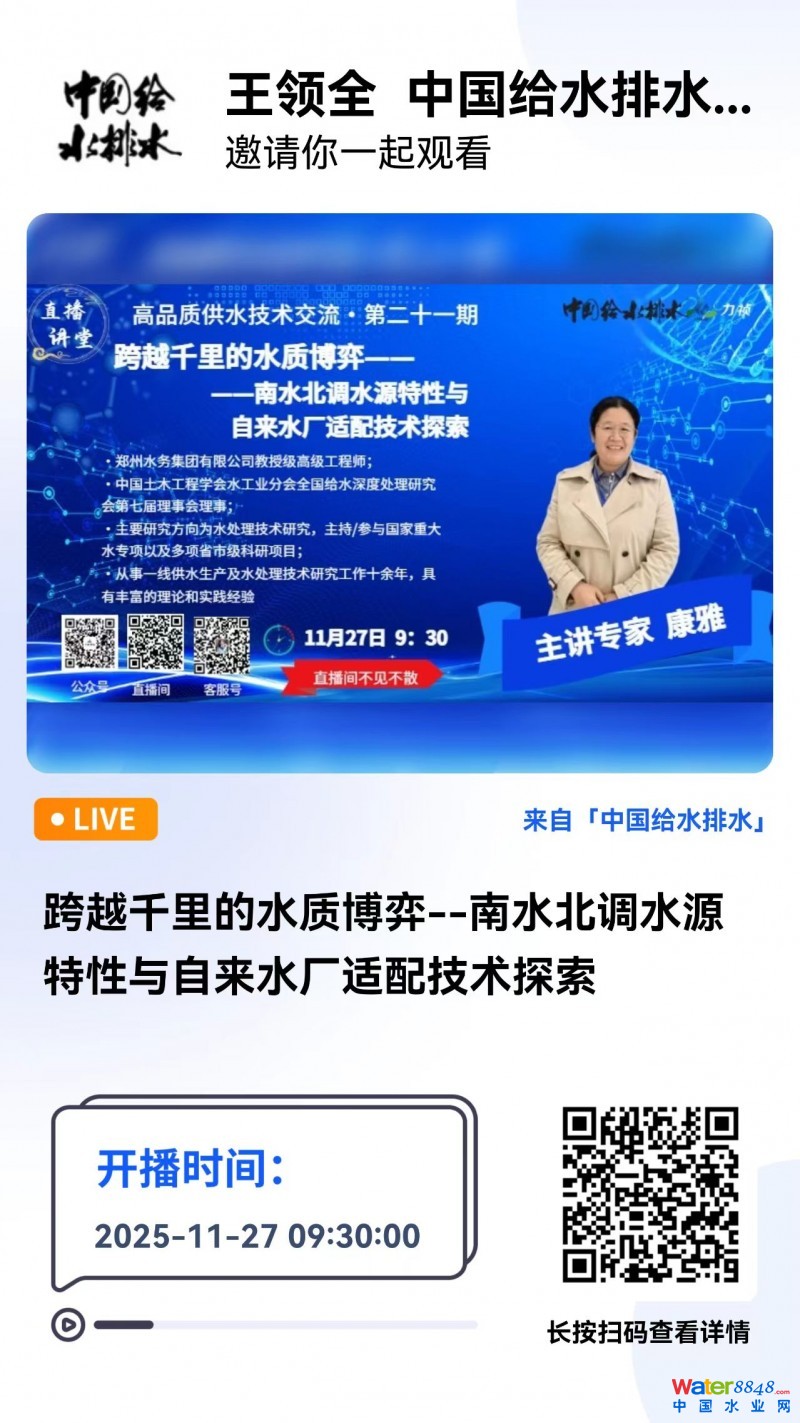 中國給水排水直播:跨越千里的水質(zhì)博弈--南水北調(diào)水源特性與自來水廠適配技術(shù)探索 主講人:康雅 鄭州水務(wù)集團(tuán)有限公司教授級高級工程師 分析南水北調(diào)通水十年期間給鄭州市供水企業(yè)帶來的沖擊與挑戰(zhàn),分析原水
