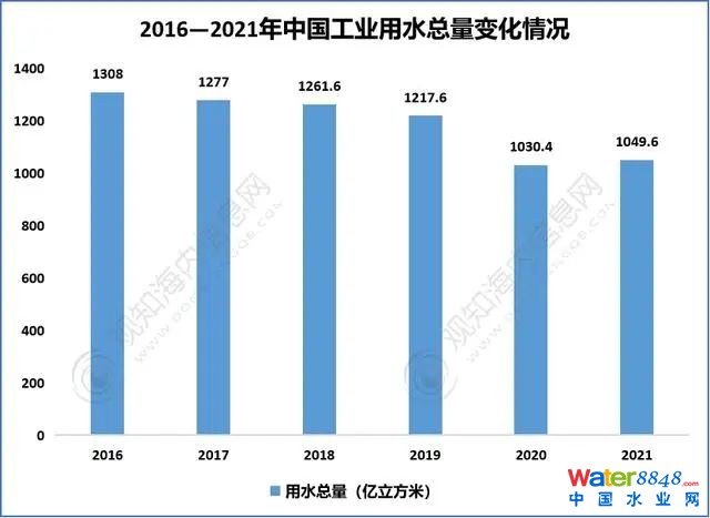 2016-2021年中國(guó)工業(yè)用水總量變化情況