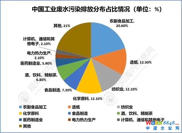 從我國(guó)工業(yè)廢水污染物排放分布情況來看,農(nóng)副食品加工業(yè)占20.60%,工業(yè)廢水污染物排放量排第一位;第二是造紙及紙制品業(yè),占12.30%;第三是紡織業(yè)、化學(xué)原料和化學(xué)制品制造業(yè),各占12.10%。